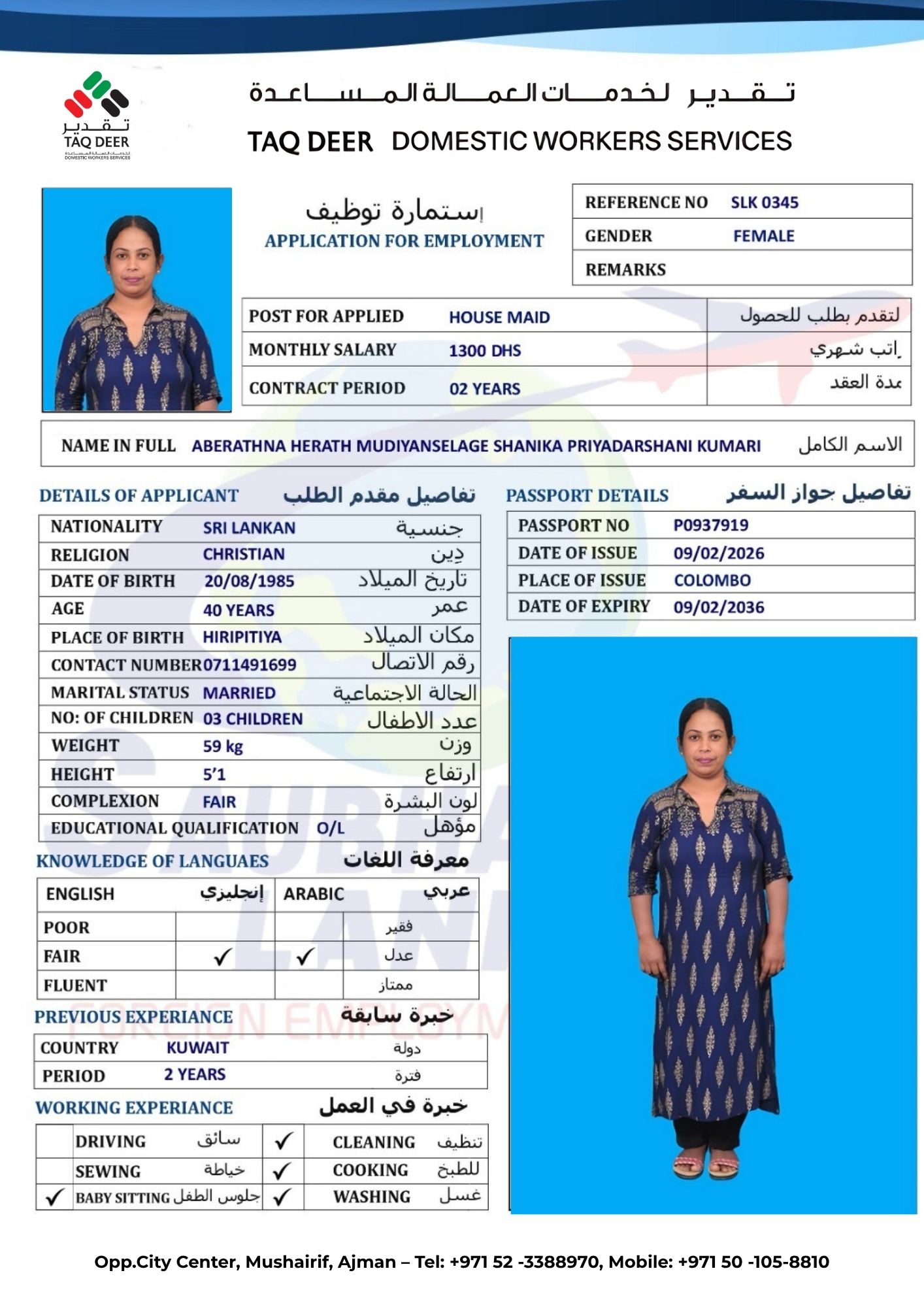 Sri Lankan Christian woman, 40 years old, working in Kuwait for 2 years as a cook