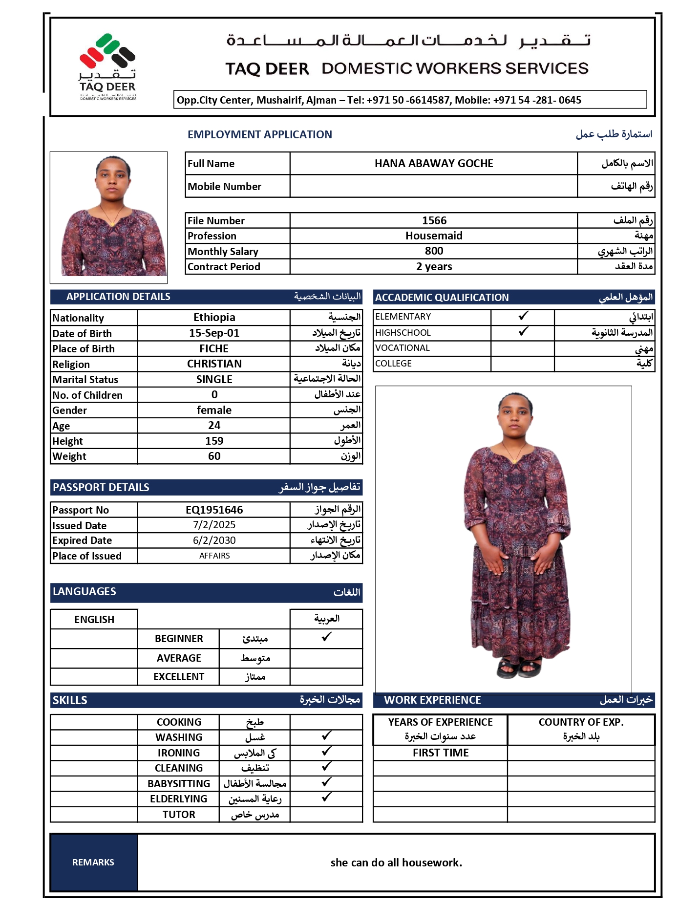 Ethiopian woman, 24 years old, Christian, first time...cleaning, washing, ironing, and seeing children