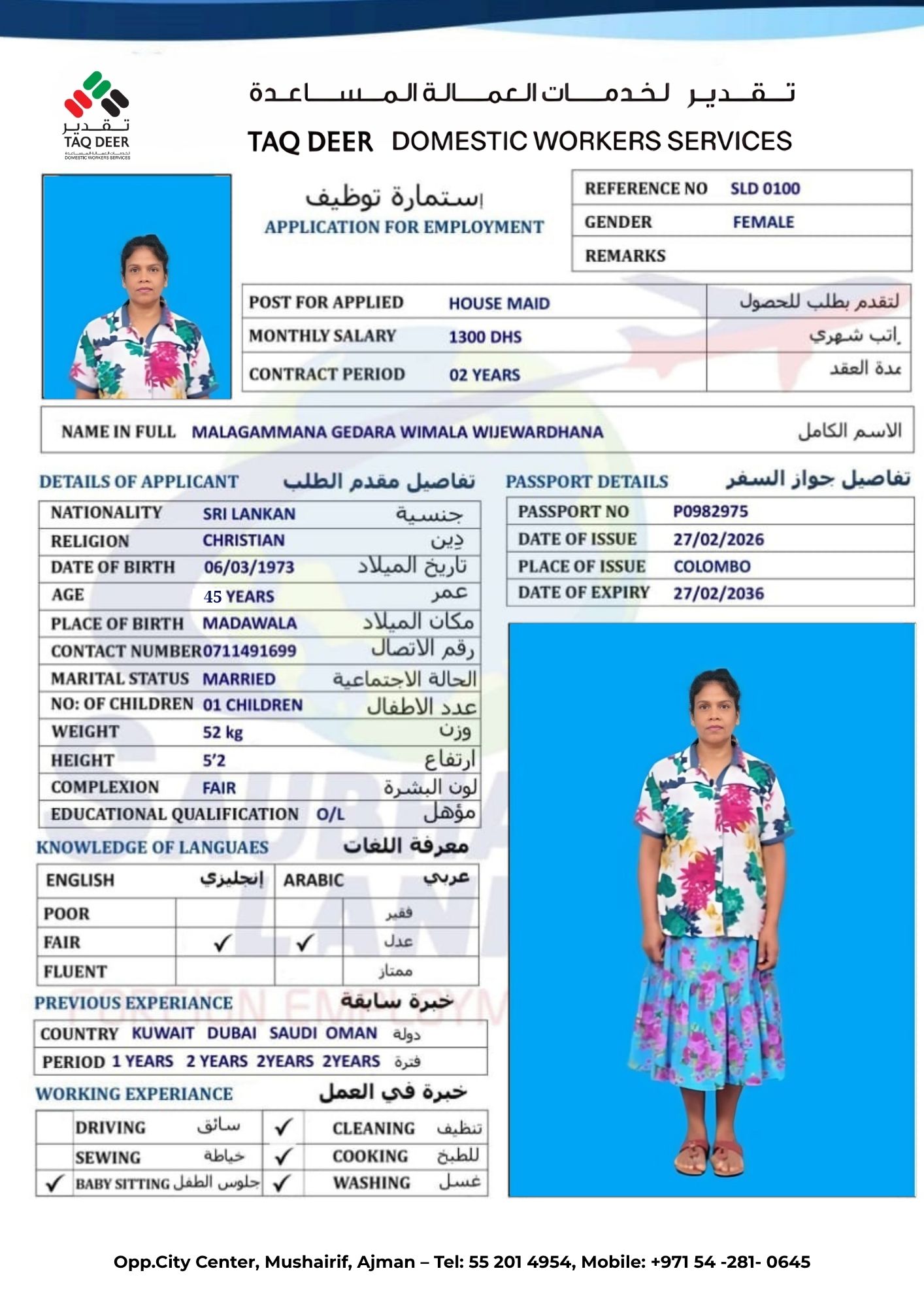 Sri Lankan Christian, 45 years old, with 7 years of experience in Kuwait (1 year), the UAE (2 years), Saudi Arabia (2 years), and Oman (2 years). She cleans and cooks.