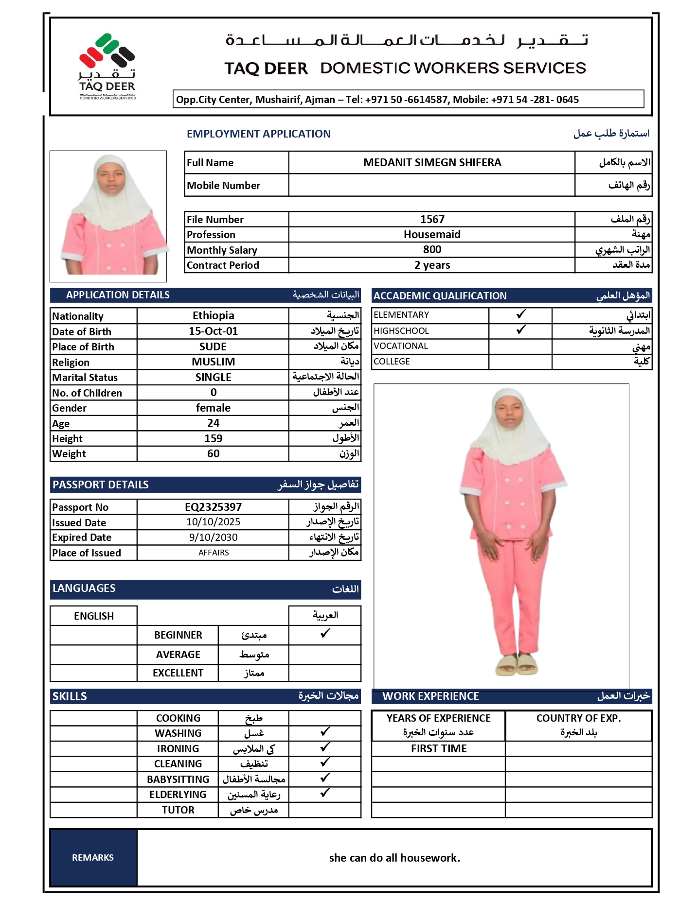 Ethiopian woman, 24 years old, Christian, first time...cleaning, washing, ironing, and seeing children