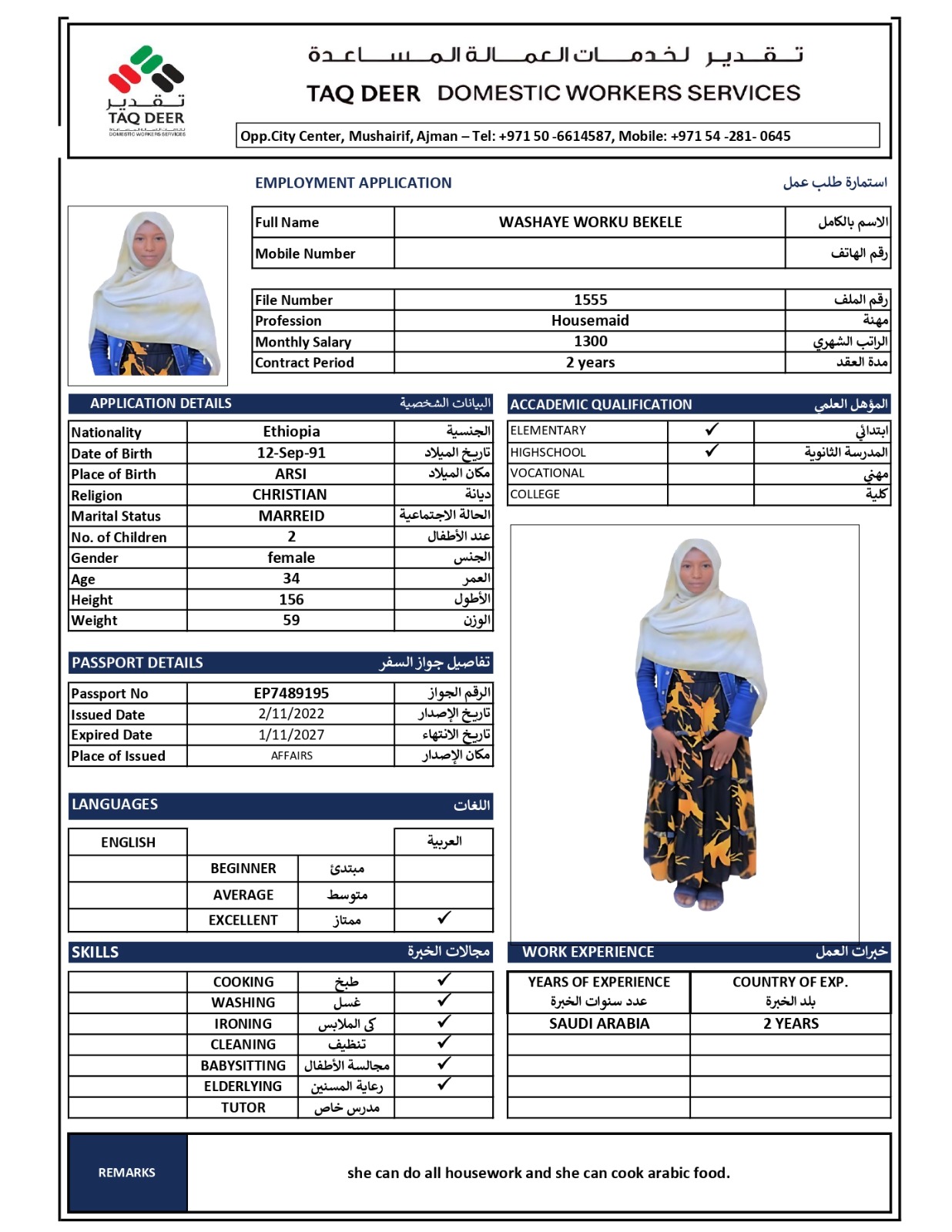 Ethiopian Christian woman, 34 years old, working in Saudi Arabia for 2 years, cleaning, washing, ironing, and cooking.