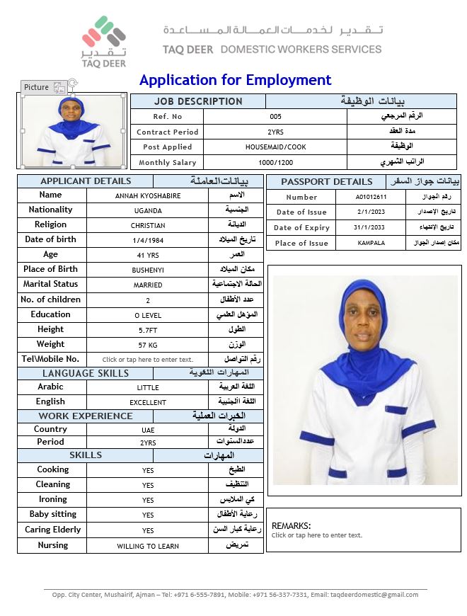 Has 2 years of experience in the UAE working as a cook and housemaid. Skilled in preparing daily meals and assisting in basic cooking according to family preferences. Experienced in full housekeeping duties, including cleaning, washing, ironing, and maintaining household cleanliness. Hardworking, trustworthy, and able to manage household tasks efficiently.