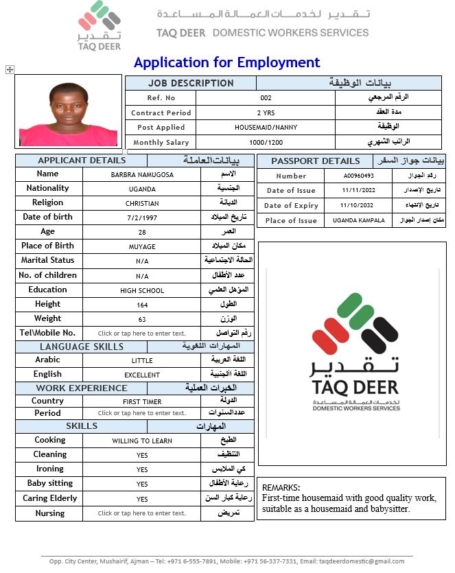 First-time housemaid, but knowledgeable in basic household chores such as cleaning, washing, ironing, and maintaining home cleanliness. Hardworking, polite, and willing to learn new tasks and follow instructions properly. Adaptable and motivated to improve skills according to employer’s requirements.