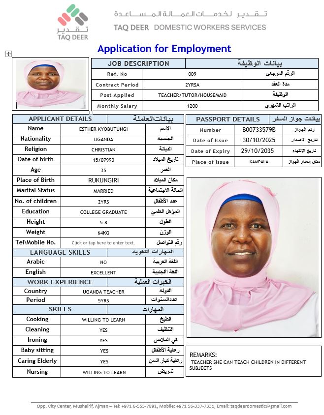 Worked as a tutor for 5 years in Uganda. Experienced in teaching and assisting students with their daily lessons and homework. Patient, responsible, and good at handling children. Can also perform household chores, including cleaning, washing, ironing, and maintaining household cleanliness when required.