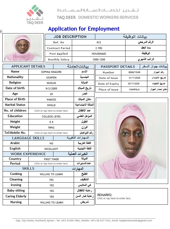 First-time housemaid, but knowledgeable in basic household chores such as cleaning, washing, ironing, and maintaining home cleanliness. Hardworking, polite, and willing to learn new tasks and follow instructions properly. Adaptable and motivated to improve skills according to employer’s requirements.